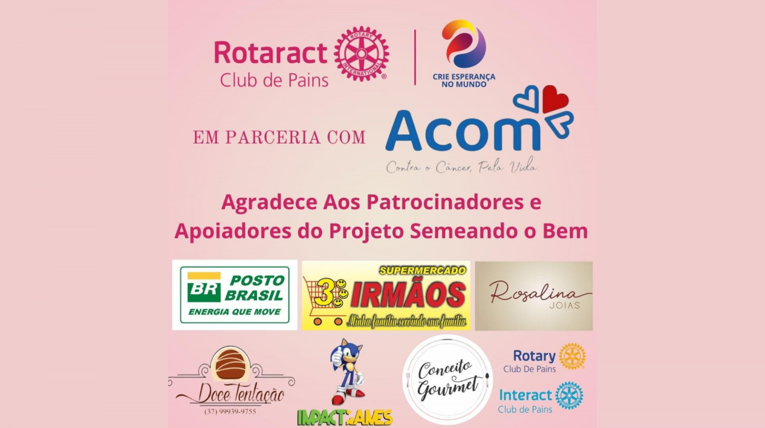 O Rotaract Clube de Pains tem como principal intuito, vender bilhetes no valor de R$10,00 sendo o sorteio transmitido via página Oficial do Clube @rctpains nos dias 04,05 e 06 de Dezembro de 2023, sendo dois sorteios por dia que será transmitido ao vivo ás 20:00hrs. Esse projeto em Parceria com a ACOM, tem como finalidade toda renda arrecadada com a venda de bilhetes ser doado 80% do valor para a Instituição ACOM, e 20% para o Projeto Natal Solidário feito anualmente pelo Rotaract Clube de Pains. O Rotaract Club de Pains Agradece seus Patrocinadores e Apoiadores do Projeto: Posto Brasil, Supermercado Três Irmãos, Rosalina Jóias, Doce Tentação, Impact Games, Conceito Gourmet, Rotary Club de Pains e Interact Club de Pains.