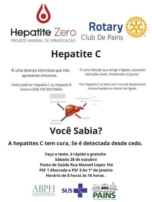 O Rotary Club de Pains em parceria com a Secretaria Municipal de Saúde realizará no dia 28 de Outubro de 2023 testes gratuitos para Hepatites B e C.