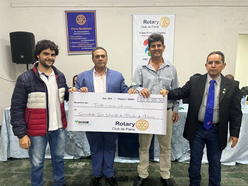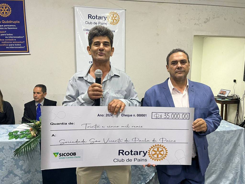 Na noite de segunda-feira 08/07/2024 durante reunião solene de posse do presidente ano rotário 2024/2025 companheiro Donizete Fonseca e seu conselho diretor, o Rotary Club de Pains realizou a entrega de um cheque no valor de R$ 35.000,00 (trinta e cinco mil reais) a Sociedade São Vicente de Paulo de Pains, entidade esta que cuida de idosos em nossa cidade.